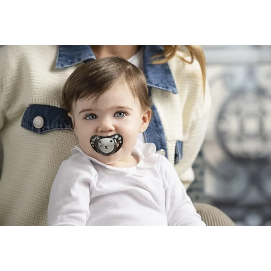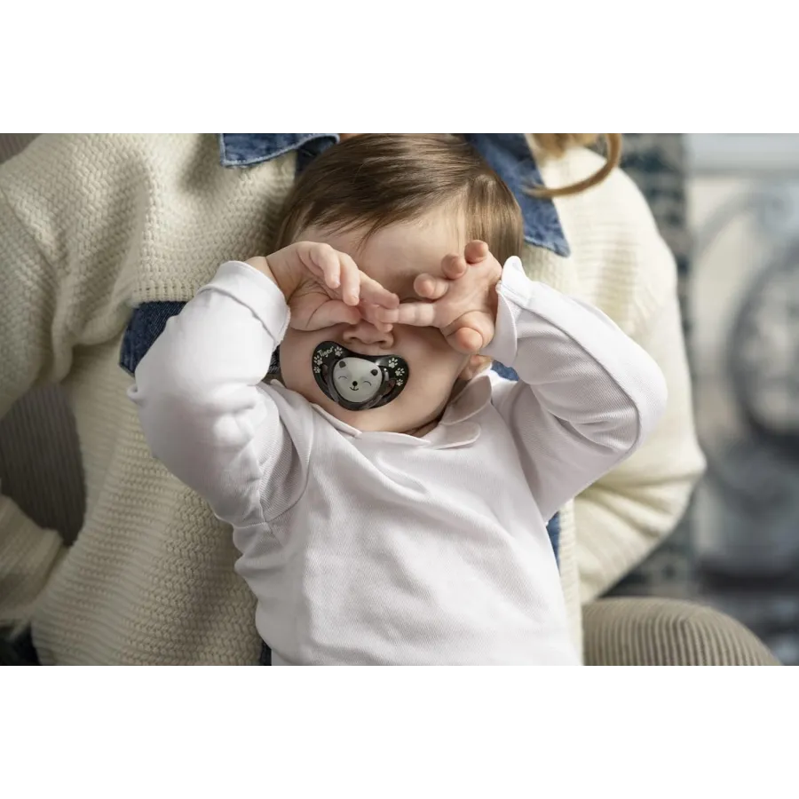 La tetina cuenta con una forma fisiológica que se adapta perfectamente a la boca del bebé, facilitando su uso y asegurando una sujeción cómoda. Además, su diseño nocturno incluye detalles que brillan en la oscuridad, lo que permite localizar fácilmente el chupete en la oscuridad sin necesidad de encender luces, ideal para las noches de sueño.