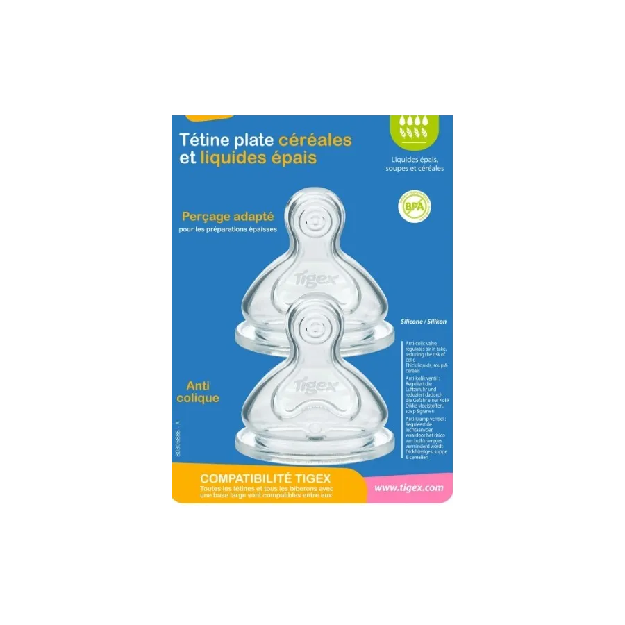 Las 2 Tetinas Transition para cereales de silicona de Tigex son la elección ideal para bebés de más de 6 meses que ya requieren un flujo rápido y una experiencia más adaptada a su ritmo. Su diseño ergonómico de cuello ancho favorece una transición natural del pecho al biberón, simulando al máximo la forma del pezón materno.