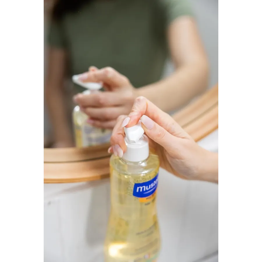 Para aplicar el aceite de baño Mustela, añade una pequeña cantidad en el agua del baño o masajea directamente sobre la piel húmeda antes de aclarar.
