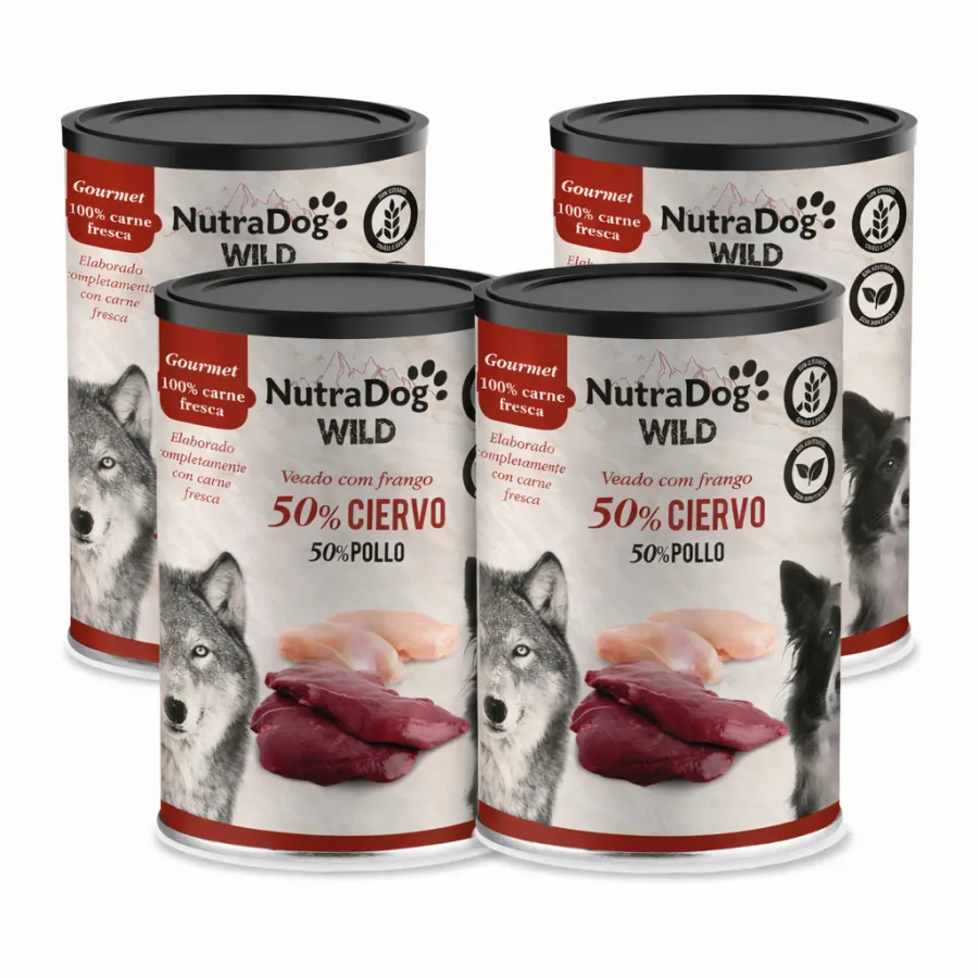 Alimento húmedo 100 % natural de ciervo y pollo para perros NutraDog WILD Gourmet. Pack Ahorro 4 x400 gr