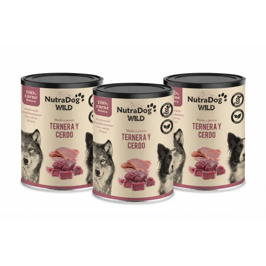 Alimento húmedo 100 % natural de ternera y cerdo para perros NutraDog WILD. Pack Ahorro 3 x 800gr