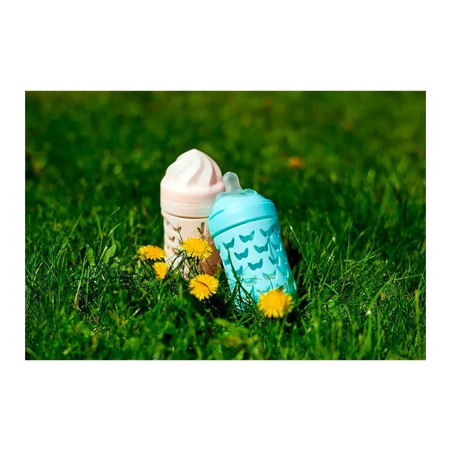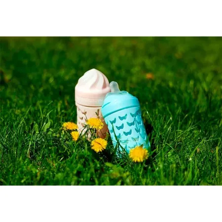 La tetina se adapta a la boca del bebé, por ser muy similar al pecho de la mamá. Además, es ergonómica con doble sistema anti-cólicos.