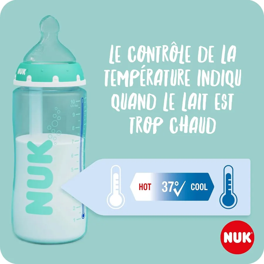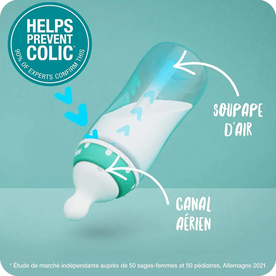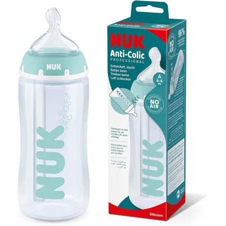 El biberón anticólico profesional con control de temperatura de Nuk ha sido diseñado para impedir la ingesta de aire durante las tomas.
