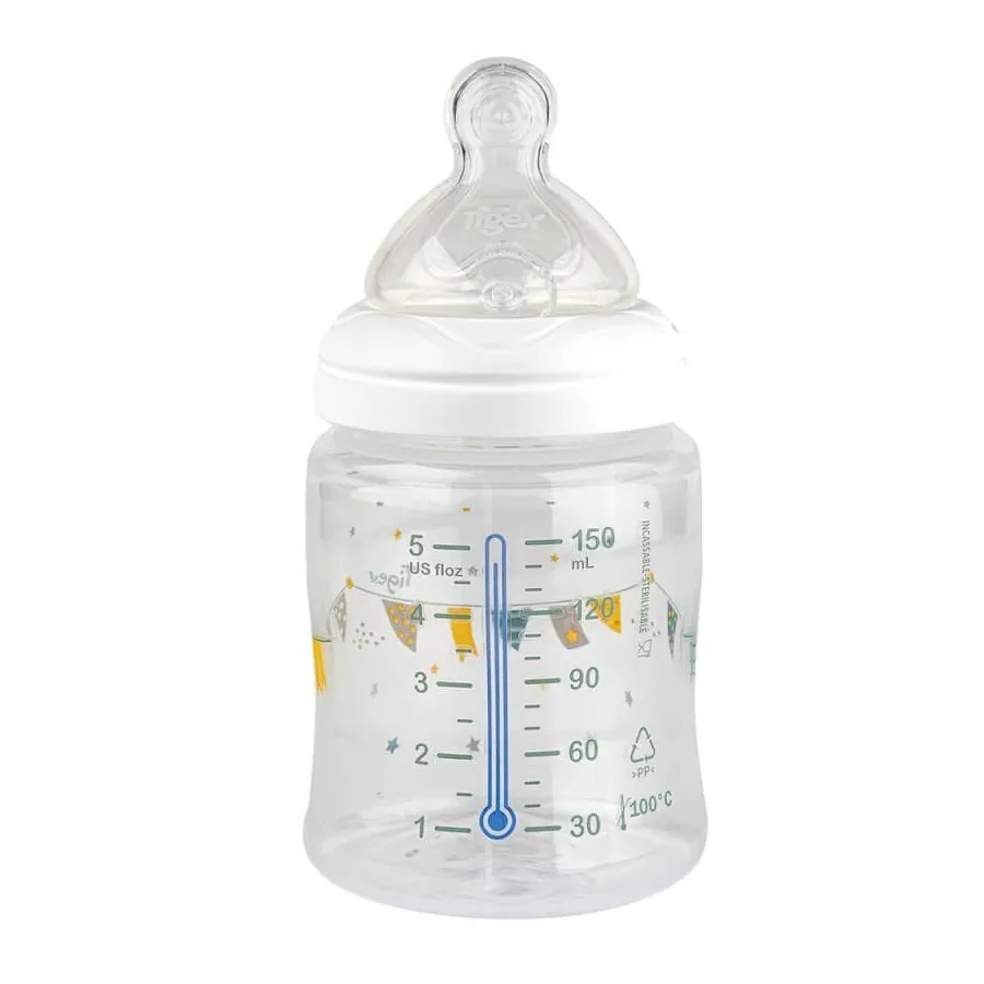 El biberón transition¡ de silicona de Tigex es la mejor opción para alimentar al bebé de la forma más natural posible. La tetina de silicona cuenta con microperforaciones que permiten un flujo de leche igual al del pecho. El bebé realiza el mismo movimiento que con la lactancia materna. Esto permite un correcto desarrollo de la mandíbula y la cavidad oral, favoreciendo el habla y respetando la dentición. Cuenta con una escala de medición y control de temperatura que se vuelve blanco si la leche está muy caliente. La válvula anticólico impide la ingesta de aire minimizando los cólicos, los gases y las molestias facilitando la digestión. Gracias al capuchón es muy fácil de transportar o agitar sin derrames. Apto desde el nacimiento. Capacidad 150ml. Libre de BPA.