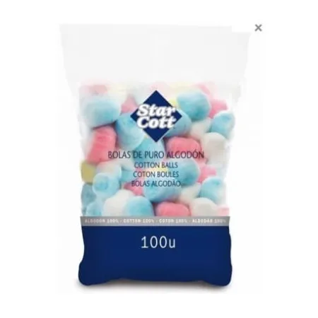 Las bolas de algodón de colores Star Cott están pensadas para fines cosméticos y sanitarios. Las bolas mantienen su consistencia con una textura suave y esponjosa que elimina fácilmente todos los restos de maquillaje del rostro. Gracias a su forma y suavidad se adaptan a las líneas del rostro logrando una limpieza profunda y agradable. Envase de 100 unidades de colores.