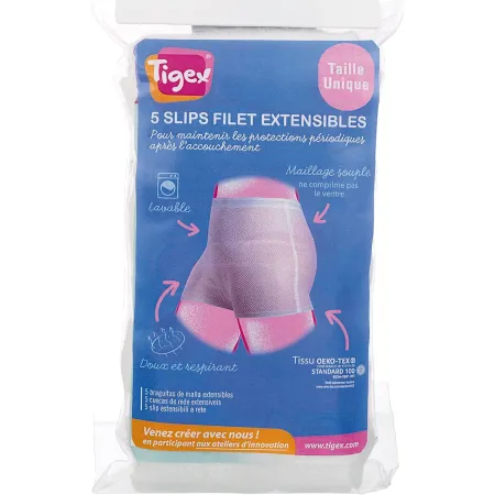 Las braguitas de malla extensible de Tigex tienen forma de culote y están pensadas para sujetar la compresa con seguridad tras el parto, cuidando al máximo la piel y la cicatrización. Su textura extra suave y su alta flexibilidad hará que apenas notes que las llevas. El tejido malla permite un alto nivel de transpiración favoreciendo una recuperación y cicatrización rápida y segura.