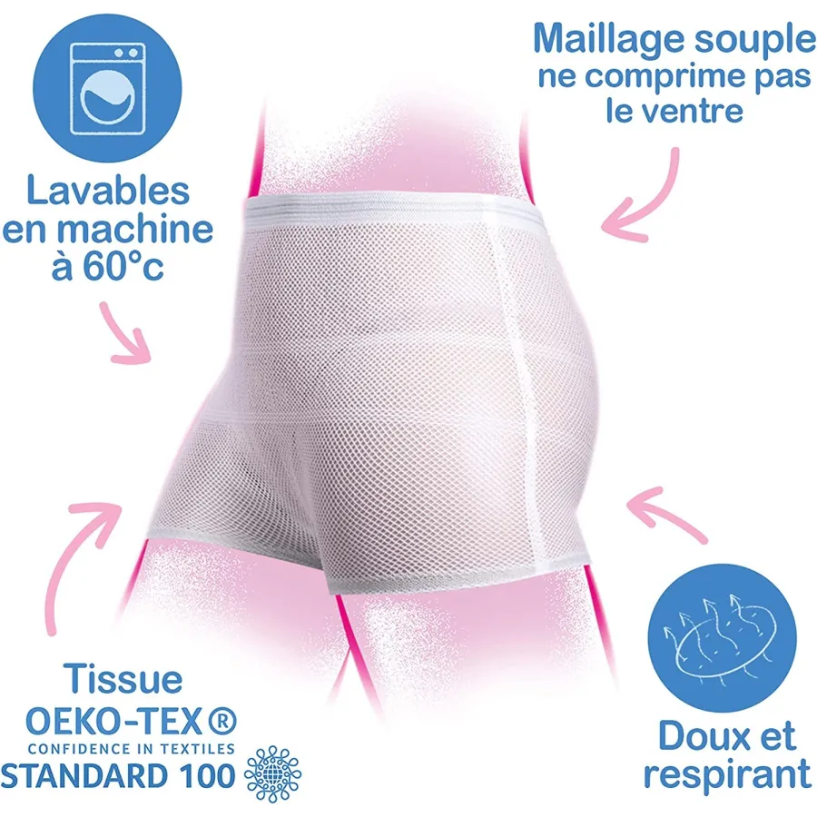 Comodidad, frescor, suavidad y cuidado es lo que se merece una mamá tras el parto. Tanto si es natural como cesárea estas braguitas extensibles fijan la compresa permitiendo la transpiración y facilitando la cicatrización.