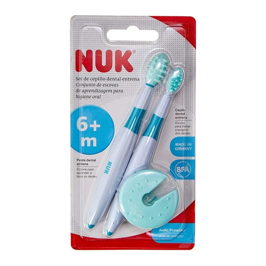 Este increíble Set de 2 Cepillos dentales de entrenamiento de NUK ha sido diseñado pensando en cómo facilitar el proceso de introducción de la higiene bucal de los bebés con más de 6 meses que sienten molestias asociadas a la dentición.