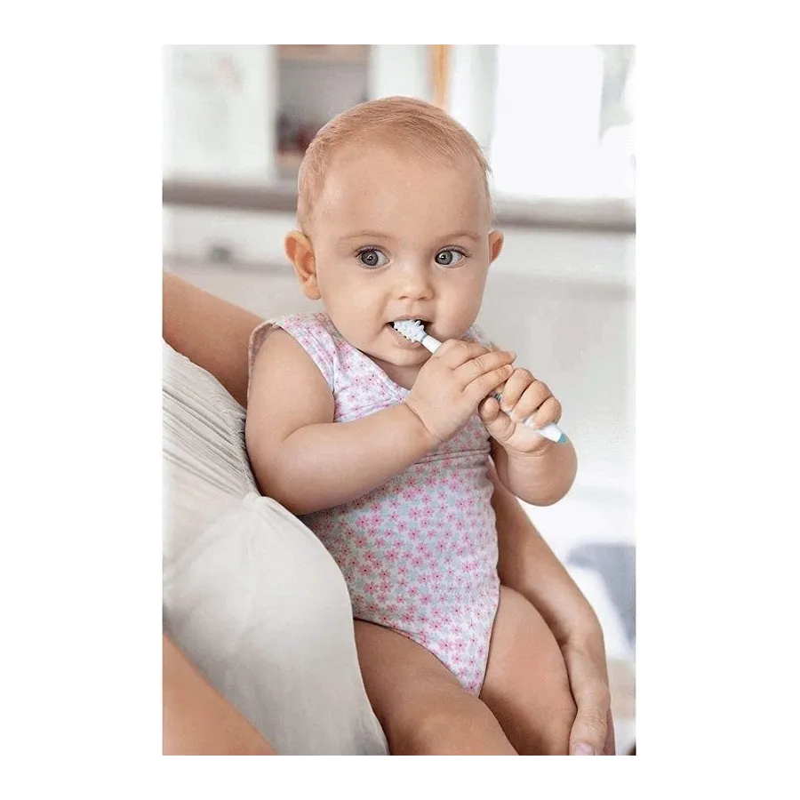 Está compuesto por cepillo dental y un mordedor que ayuda a enseñar a los pequeños como empezar a cepillarse correctamente y a calmar la presión que suelehacer en las encías.