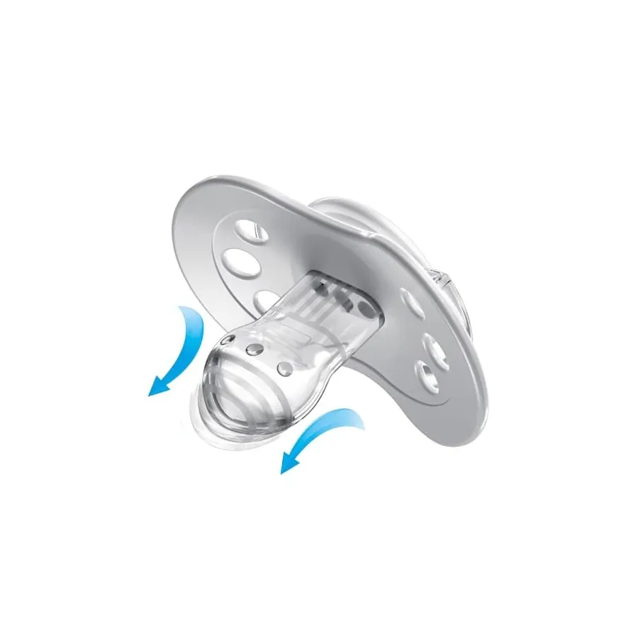 *Permite mantener una succión saludable: Gracias al diseño de la tetina dinámica se garantiza que exista una respiración libre a través de su naricita y que a la vez pueda tragar saliva, lo que evita el reflejo de morder, permitiendo de esta manera, el correcto desarrollo del habla y del encaje de los maxilares.