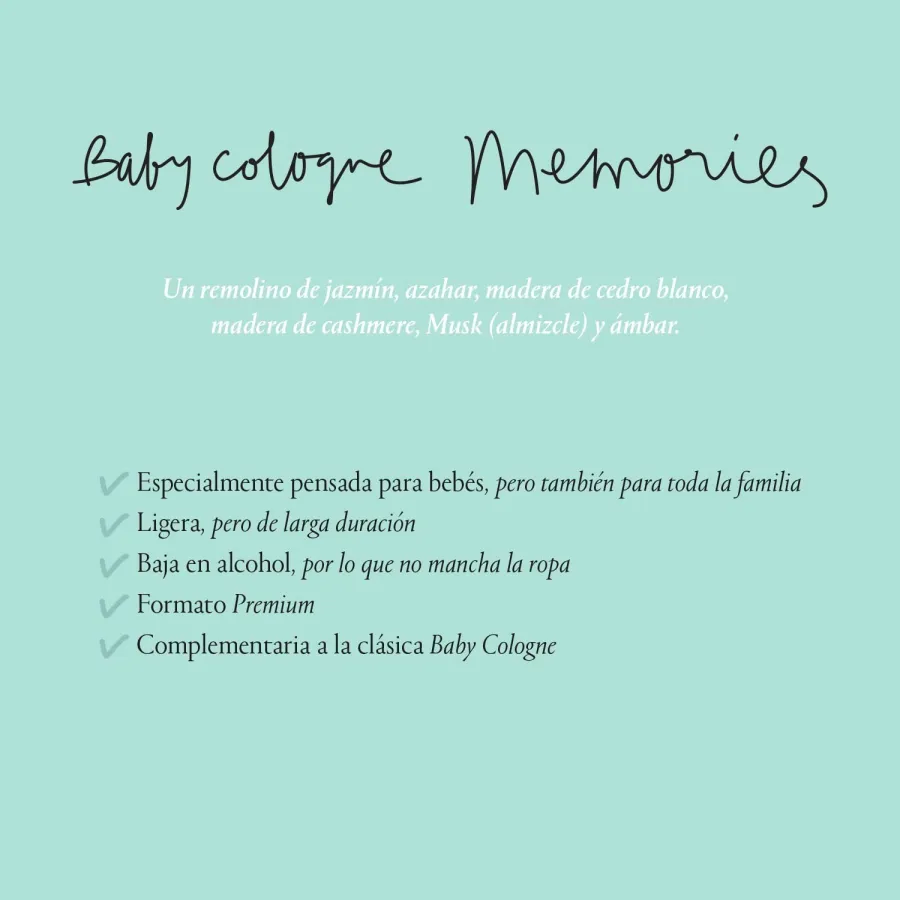 La colonia infantil Memories 100ml de Suavinex está elaborada con extracto de jazmín, azahar, madera de cedro blanco y cashmere, almizcle y ámbar. Tiene un aroma ligero pero muy duradero y favorece una atmósfera de bienestar y confort. Aplícalo en tu mano para pasarlo suavemente por el bebé estimulando los sentidos. Fabricado para bebés y pensado para toda la familia es muy bajo en alcohol evitando la producción de manchas