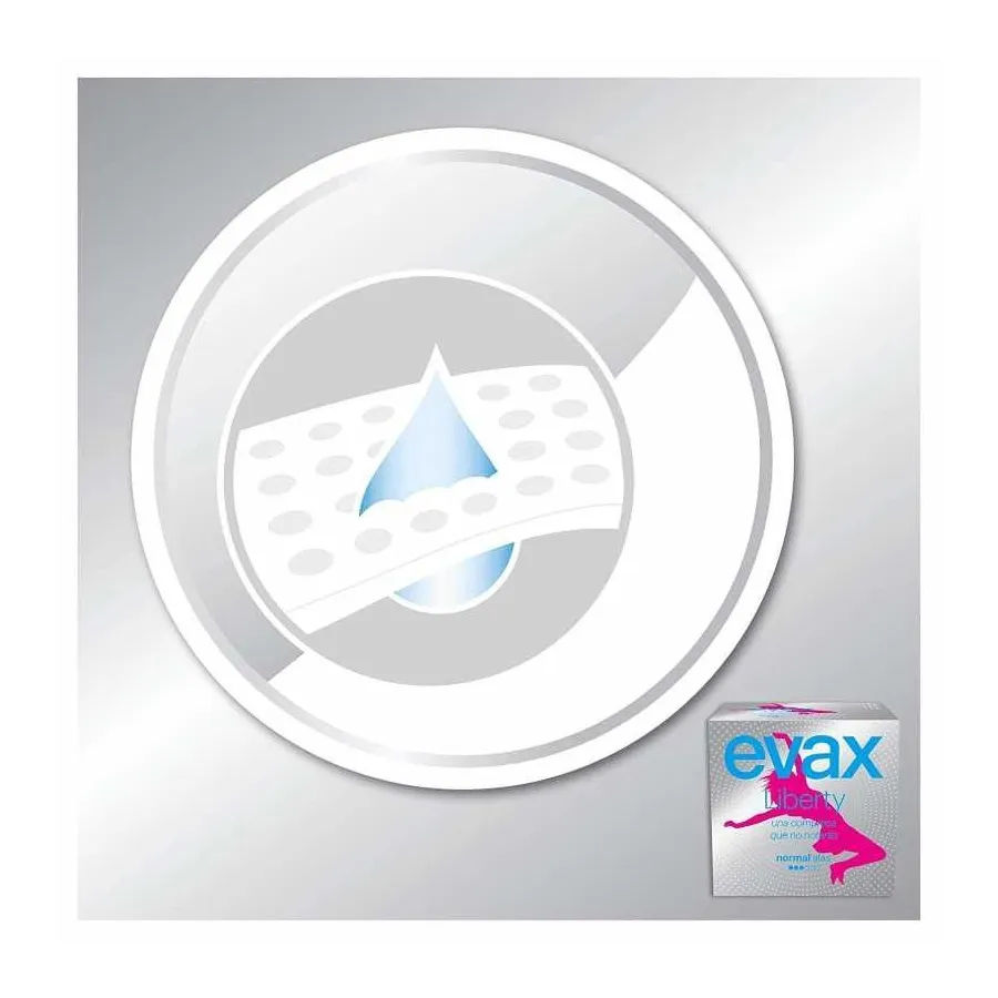 EVAX Liberty es la compresa más, más, más diferente de todas. EVAX Liberty está fabricada íntegramente con Flexicel, un material exclusivo que se adapta perfectamente a tu cuerpo para que no la notes ni la sientes, y elimina la humedad de la piel para mantener la sensación de comodidad y limpieza durante todo el día. Además, tienen una delicada fragancia que neutraliza el olor y garantiza el frescor. Da un paso más en tu higiene íntima gracias a las compresas EVAX Liberty que son 40% más absorbente que las EVAX Cottonlike