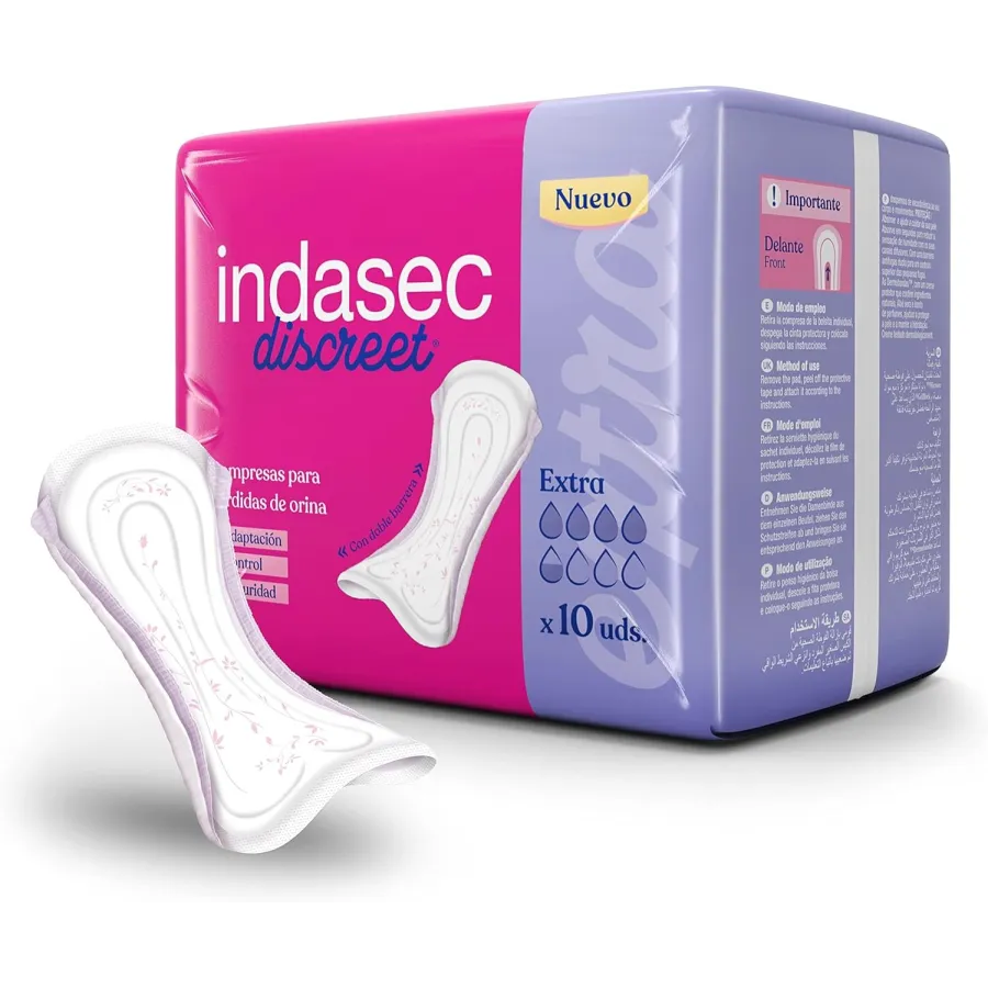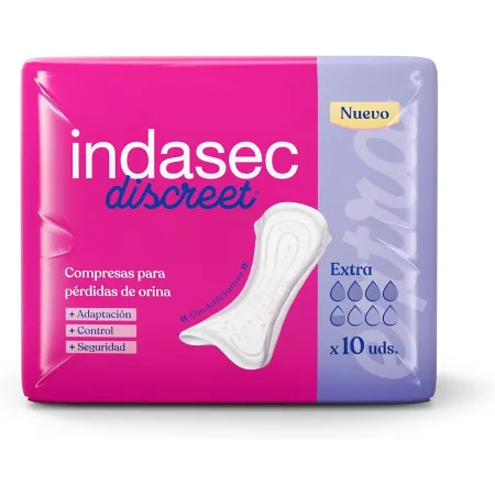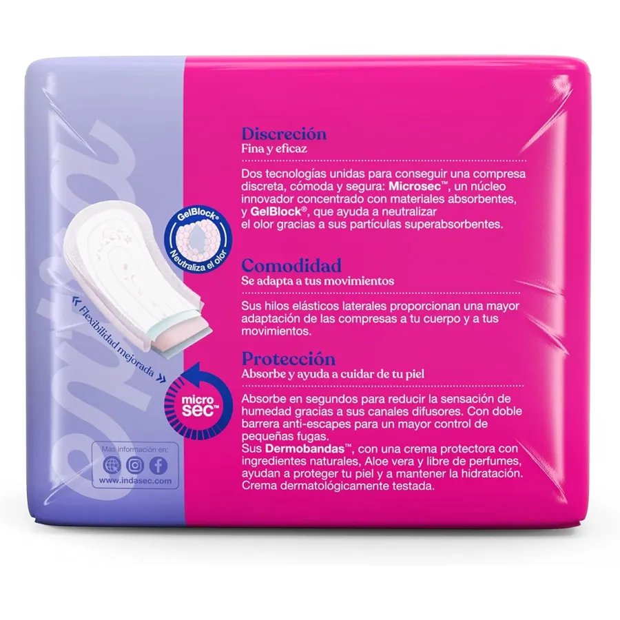 Las compresas Indasec Discreet han evolucionado para ofrecerte la mejor protección y cuidado frente a las pérdidas moderadas de orina. Cuentan con doble tecnología y ofrecen múltiples ventajas en cuanto a las convencionales. Las compresas discreet han sido creadas para estés tranquila y te sientas libre en todos tus movimientos. La tecnología Microsec es un núcleo innovador concentrado de agentes altamente absorbentes que te mantienen seca al instante el Gelblok neutraliza eficazmente el olor. Además, estas compresas cuentan con Dermobandas que incluyen una crema protectora de ingredientes naturales y Aloe Vera que protegen tu piel manteniendo la hidratación. Esta novedosa compresa absorbe al instante gracias a los canales difusores que distribuyen la humedad rápidamente y cuentan con doble barrera antiescapes.