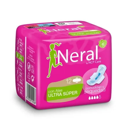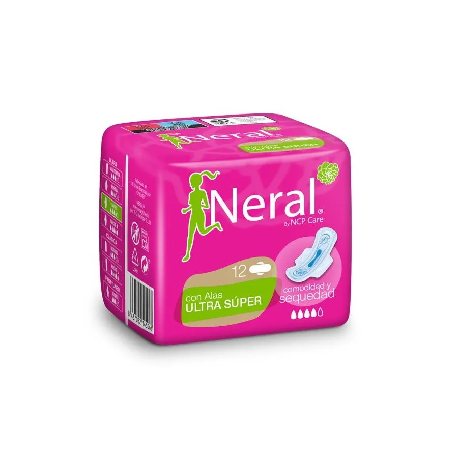 Las compresas ultra super con alas de Neral han sido diseñadas para brindarte protección y comodidad durante el día. Cuentan con alas para una mayor sujeción a la ropa interior y un ajuste perfecto que se adapta al cuerpo. Gracias a la capa superior que absorbe al instante te sentirás seca y segura durante los días de flujo abundante. Estas compresas incorporan pequeños canales para proteger dónde más se necesita y doble barrera anti fugas para tu tranquilidad. Formato paquete de 12 unidades.