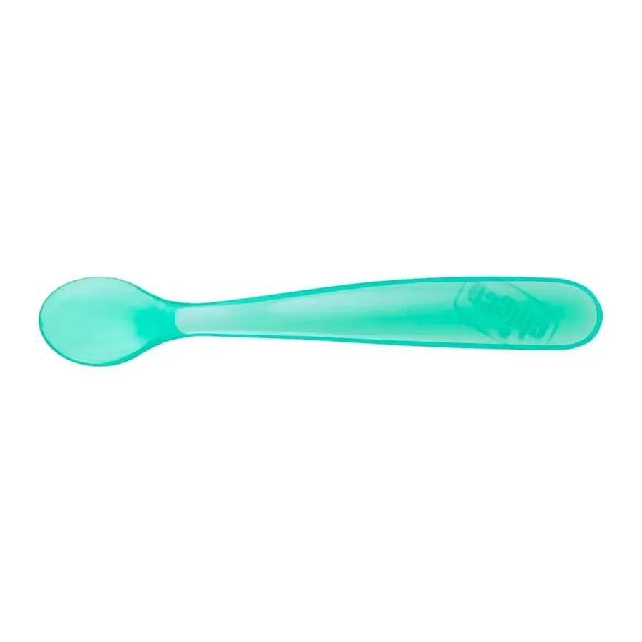 Cuchara blanda de silicona que permite alimentar al bebé de manera delicada, gracias a una punta flexible que ayuda a proteger las encías; el largo mango ergonómico proporciona una sujeción cómoda para alimentar al bebé; es fácil mantener la punta de la cuchara limpia gracias a su innovadora forma que hace que nunca toca la mesa cuando se coloca sobre ella; apto para lavavajillas.