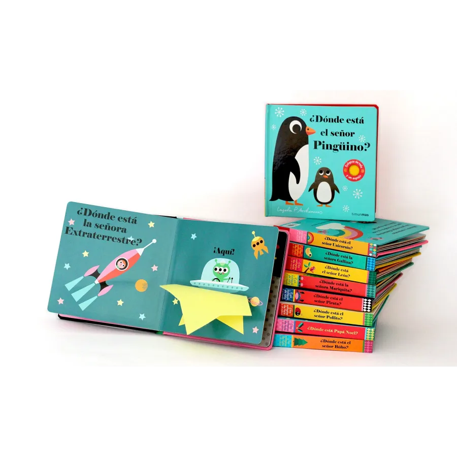 En ¿Dónde está el señor Pollito?, los pequeños lectores deben encontrar el conejito, la ovejita, el gatito y el pollito. Cuando levanten la última solapa… ¡se verán en el espejo!