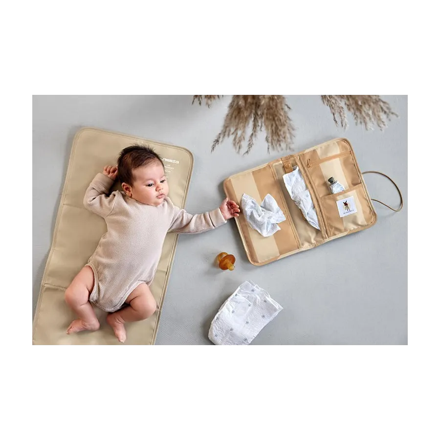 El cambiador portátil beige de Lässig es una solución pensada para quienes necesitan comodidad en cualquier momento del día. Se pliega fácilmente y cabe en cualquier bolso, mochila o compartimento del carrito. Su diseño minimalista permite llevar pañales, toallitas húmedas y accesorios esenciales en sus compartimentos internos.