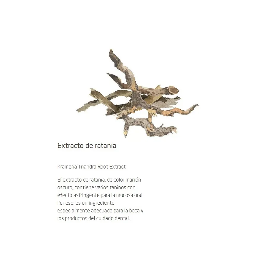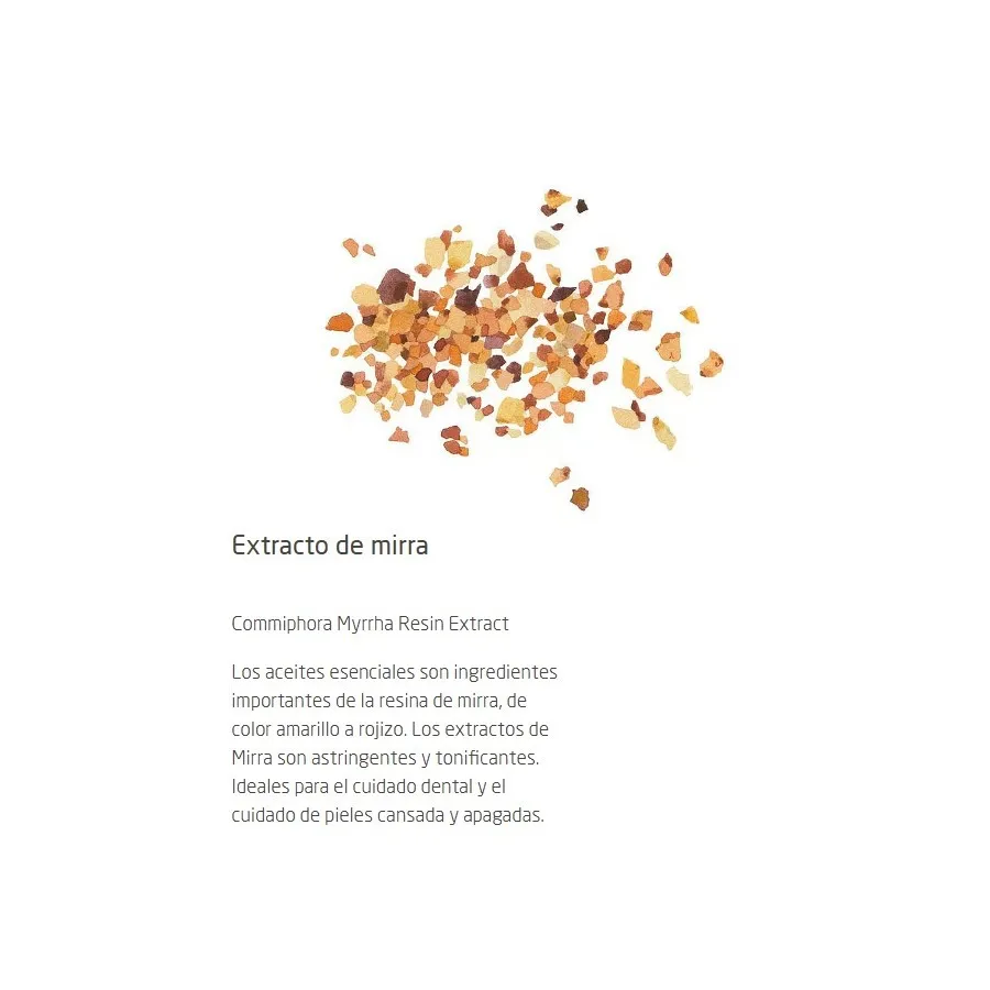 Composición: Extracto de mirra, extracto de raíz de ratania, aceites esenciales naturales, alcohol, agua, extracto de corteza de castaño de Indias, fluoruro de calcio, sulfato de magnesio, lactosa, limoneno, linalool y eugenol.
