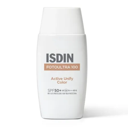 Fotoultra Active Unify Color SPF 50, 50ml. ISDIN es un fotoprotector facial con color especialmente formulado para pieles con hiperpigmentación o tono desigual. Gracias a su triple acción despigmentante y a una protección muy alta frente a rayos UVB, UVA y luz azul, este tratamiento actúa sobre las manchas, previene su reaparición y mejora visiblemente la textura y apariencia de la piel.