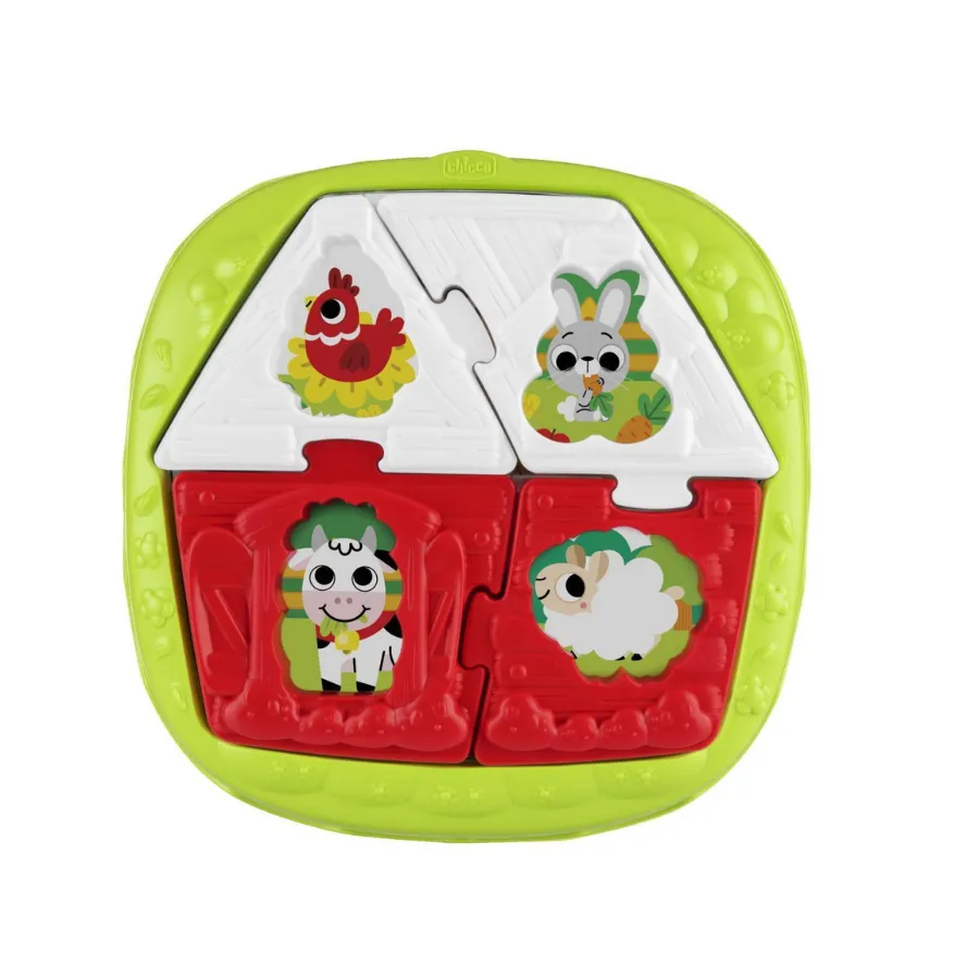 El House & Farm Puzzle Chicco es un juguete educativo de encaje, diseñado para que los más pequeños desarrollen su capacidad de clasificación, coordinación y reconocimiento de formas. Este puzzle infantil de 10 a 36 meses está compuesto por dos escenarios: una casa y una granja, que permiten a tu bebé explorar dos entornos distintos en un solo juego.
