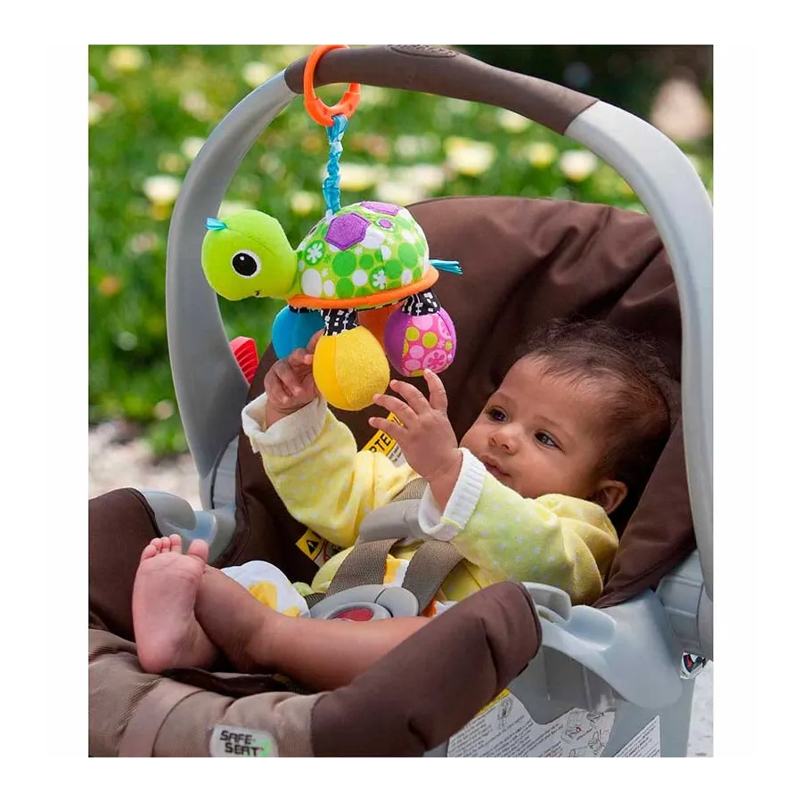 Viene con un aro en la parte superior del caparazón para colgarla del arco de actividades, en la silla de paseo, en la cuna o en el carrito.