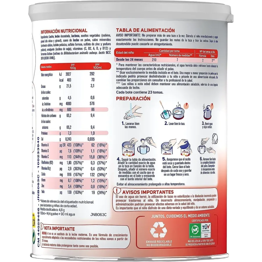 La Leche Nidina 4 de Nestlé es una fórmula infantil especialmente diseñada para niños de 2 a 6 años. Su mezcla única de nutrientes apoya el crecimiento y desarrollo óptimo de tu pequeño, asegurando que obtenga la energía y los elementos esenciales que necesita en esta etapa crucial.