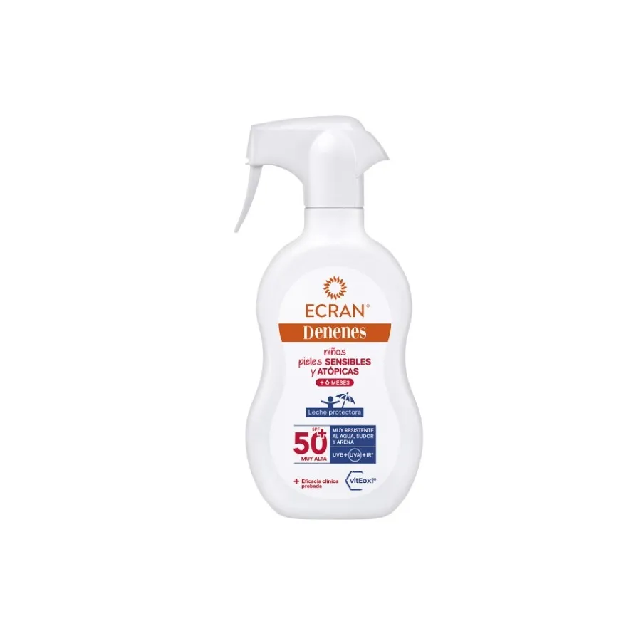 Leche protectora solar infantil para pieles sensibles y atópicas SPF50+ pistola 270ml. Denenes