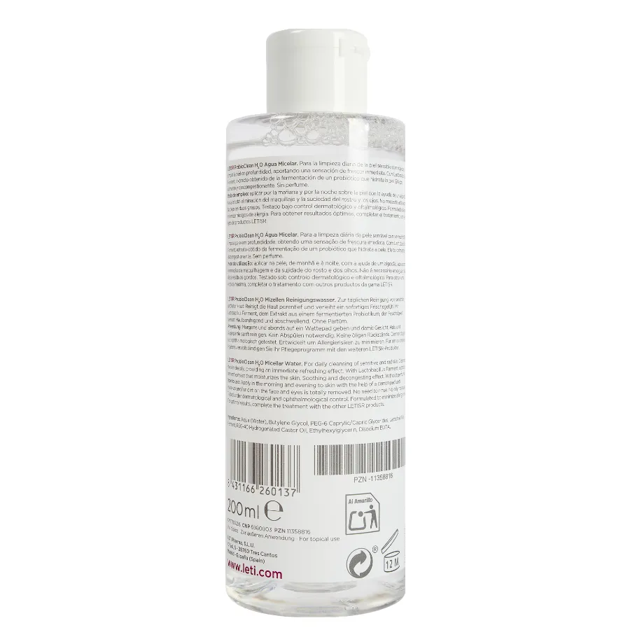 El agua micelar LETISR ProbioClean 200ml es un limpiador facial diseñado específicamente para pieles sensibles, con rosácea o cuperosis. Su fórmula incorpora Lactobacillus ferment, un probiótico que refuerza la barrera cutánea, y está enriquecida con agentes hidratantes que limpian sin resecar.