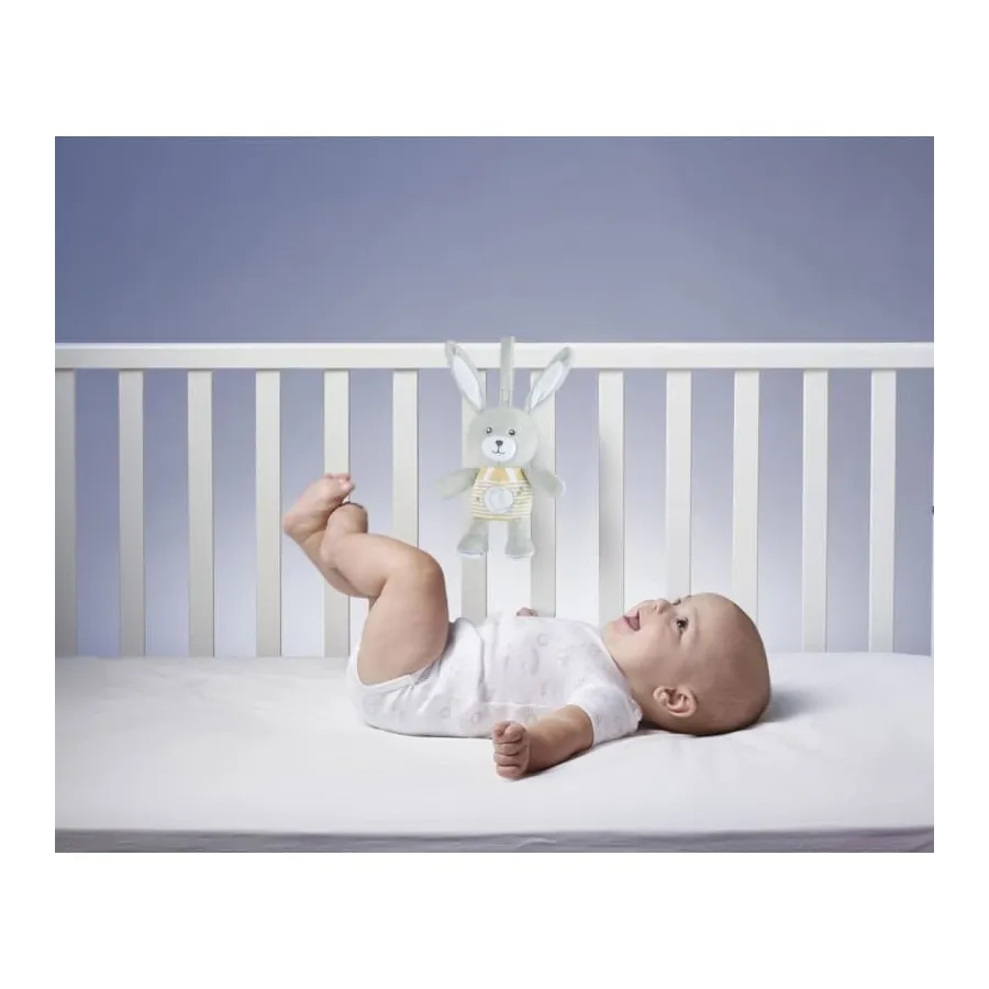 Desde los 0 meses el bebé estimula el oído y la visión acompañado por un amigo suave que le aporta calma y le ayuda a conciliar el sueño. Se puede configurar para que emita luz y melodías o sólo melodías.