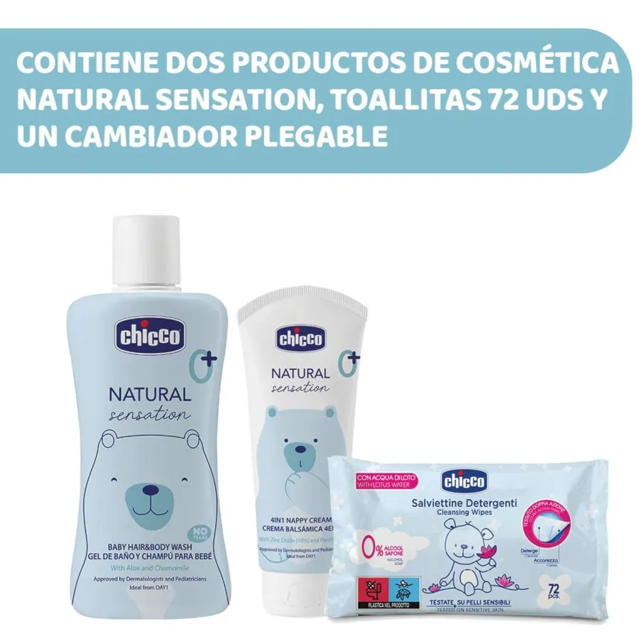 -INCLUYE COSMÉTICA: Limpia e hidrata la piel del bebé: Gel de cuerpo y cabello 200ml, crema balsámica de pañal 100ml y toallitas limpiadoras Chicco 72 ud.