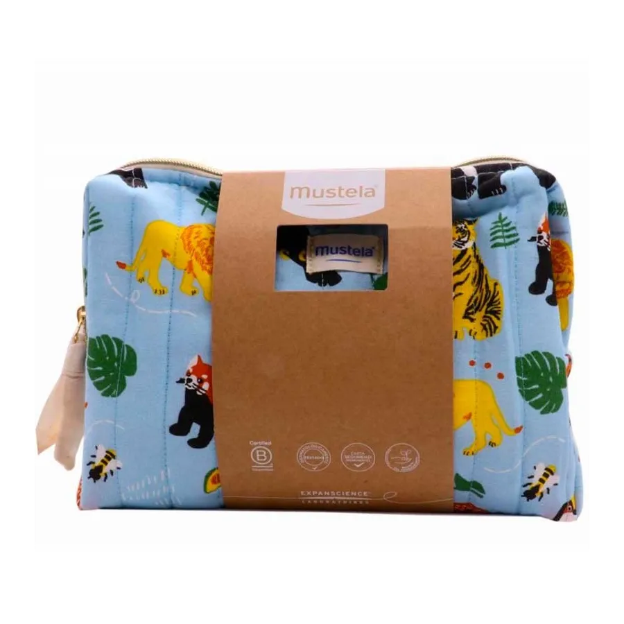 Precioso Neceser jungla con primeros productos de Mustela , con el 96 % de ingredientes naturales , buenos para la piel del bebé y bueno para el planeta