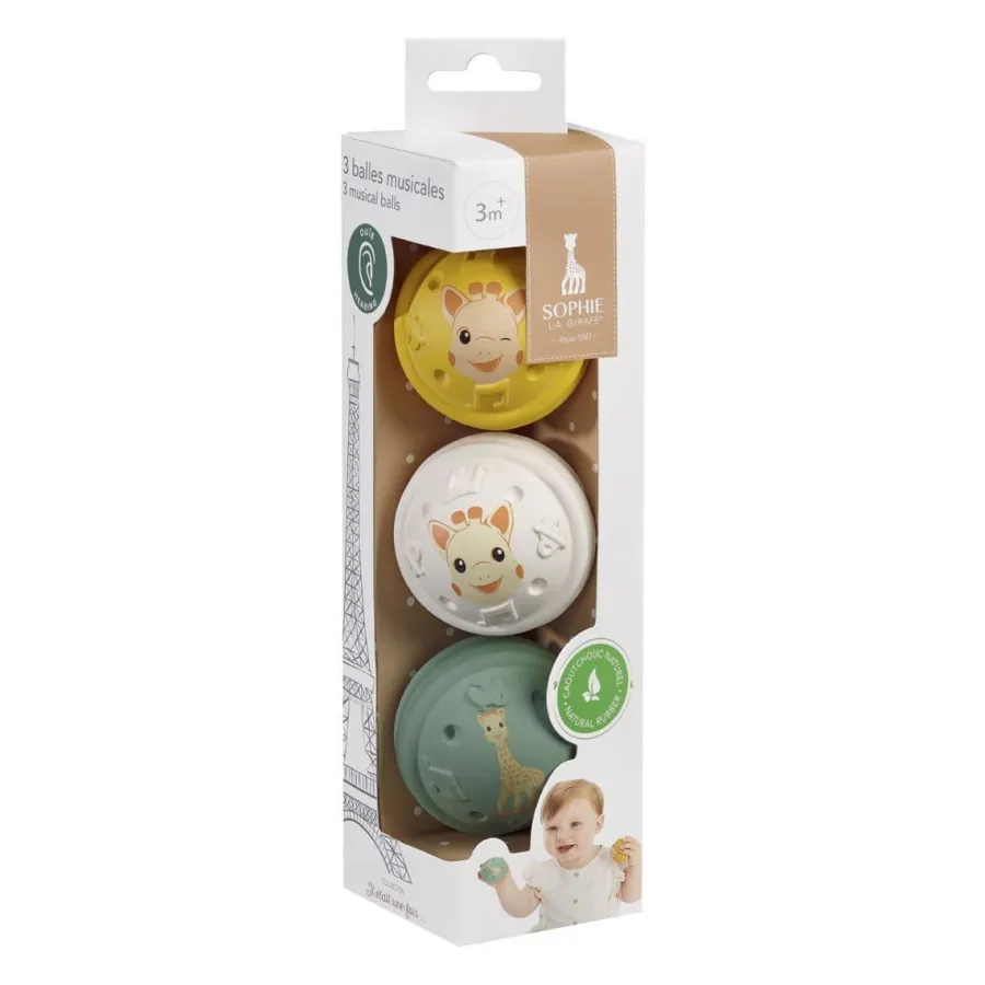 Pack de 3 bolitas musicales con sonido 100% hevea . Sophie la girafe
