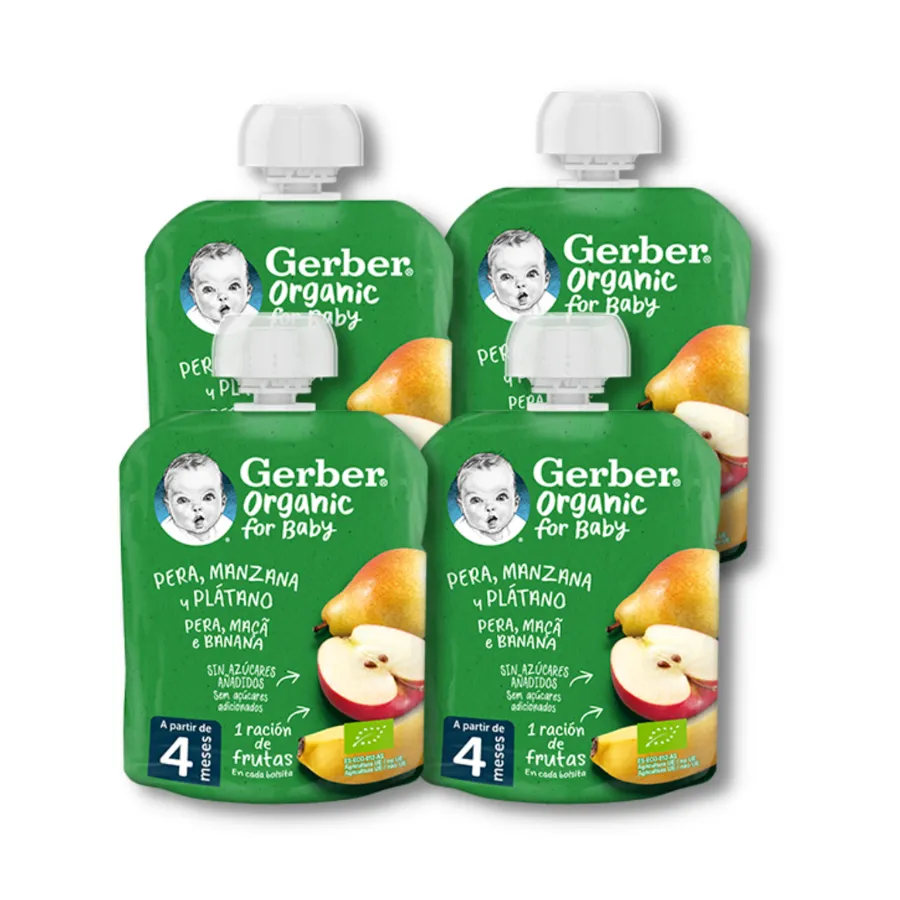 ¡Descubre el delicioso y nutritivo pack de 4 bolsitas Gerber, una opción ideal para la alimentación de tu bebé! Cada bolsita contiene una mezcla sabrosa de pera, manzana y plátano, cuidadosamente elaborada para ofrecer una experiencia de sabor única y saludable.
