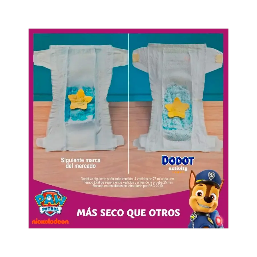 Con un núcleo de absorción conformado por partículas súper-absorbentes que ayudan a trasforman el pipi en perlas de gel. Todo eso para permitir que se disminuya el tiempo de contacto de la humedad con la piel de tu bebe, consiguiendo un pañal más seco y máxima protección para la delicada piel de tu peque.