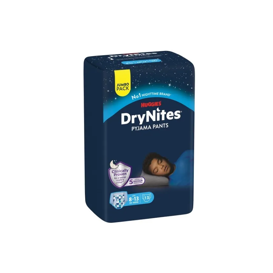 Los pañales nocturnos DryNites de Huggies (versión niño 8-15 años) están diseñados para niños que ya no usan pañal durante el día, pero pueden presentar escapes nocturnos.
