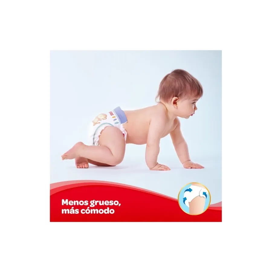 Con su tecnología Dry Touch, ayuda a mantener seca la piel de tu pequeño mientras descubre un mundo nuevo. Gracias a los canales de aire y la capacidad anti acumulación del pañal, los bebés pueden moverse a su aire.