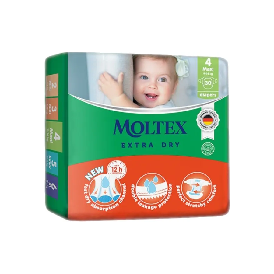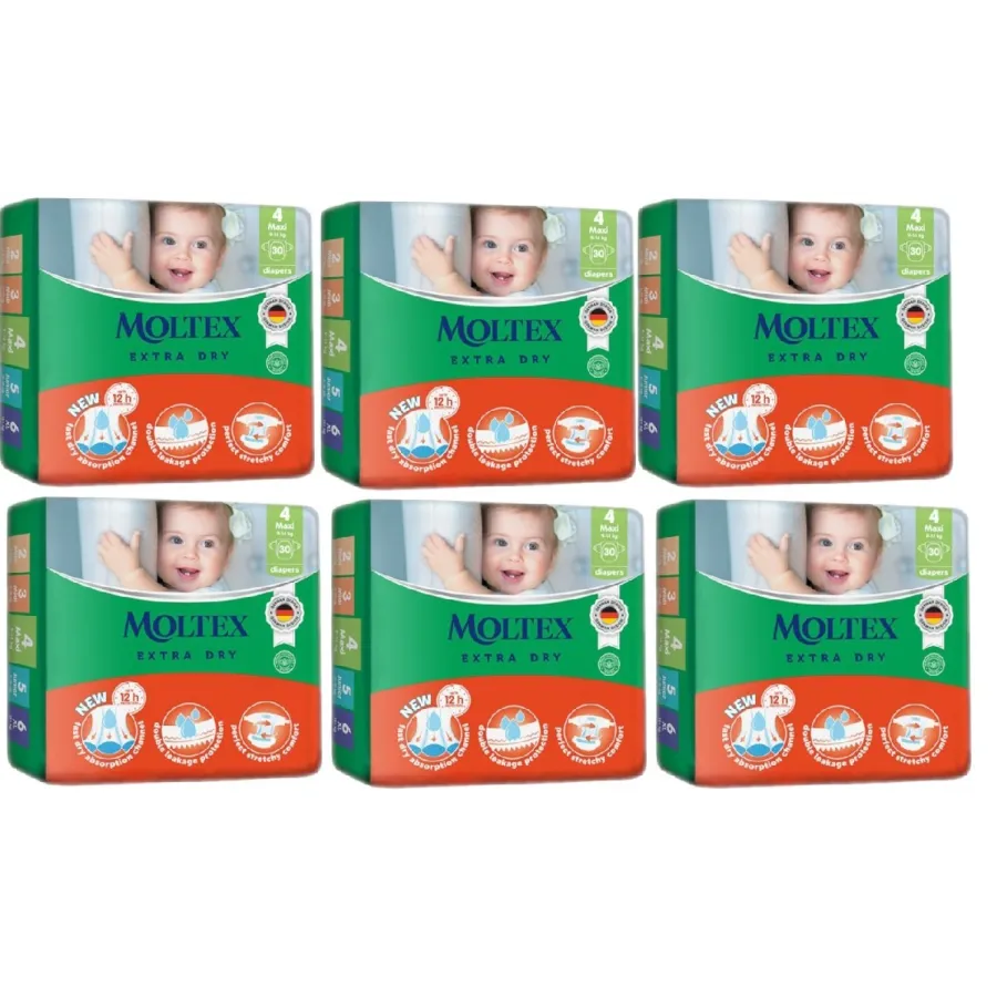 Pañales Talla 4 Extra Dry Moltex (9 a 14 kg). Pack Ahorro 6 x 30