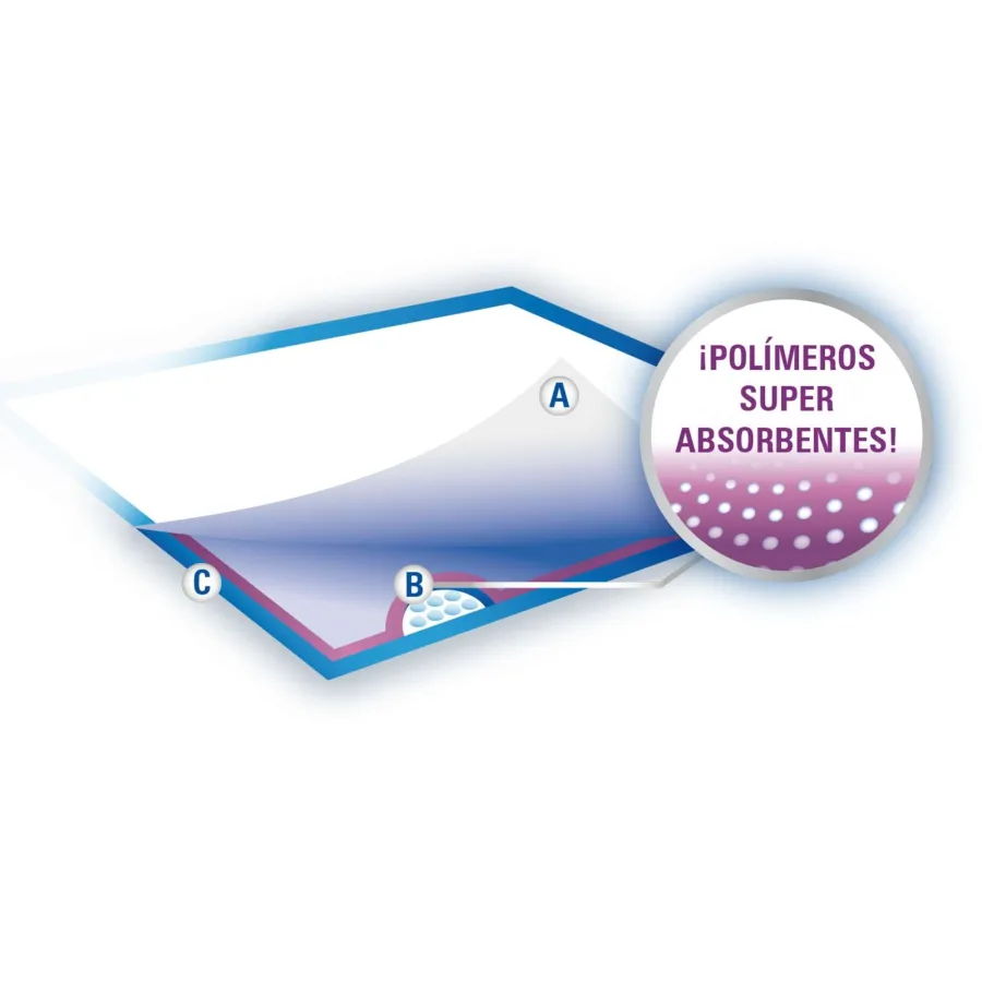Paños de adiestramiento. Fórmula con máxima capacidad de absorción, fabricados con Polímeros Super Absorbentes (SAP) capaces de retener hasta 100 veces su volumen. Protege alfombras, moquetas y pisos con su capa inferior plástica impermeable. Fácil adiestramiento para perros y cachorros que permanezcan en casa.