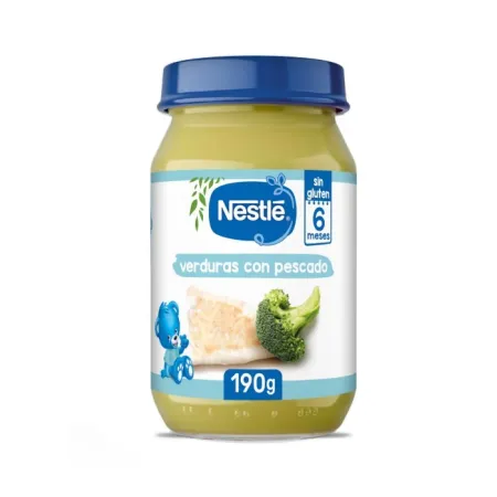 El potito de puré para bebés NESTLÉ Verduras con Pescado es una comida nutricionalmente completa y equilibrada para bebés, sin sal añadida, adaptada para bebés a partir de los 6 meses.