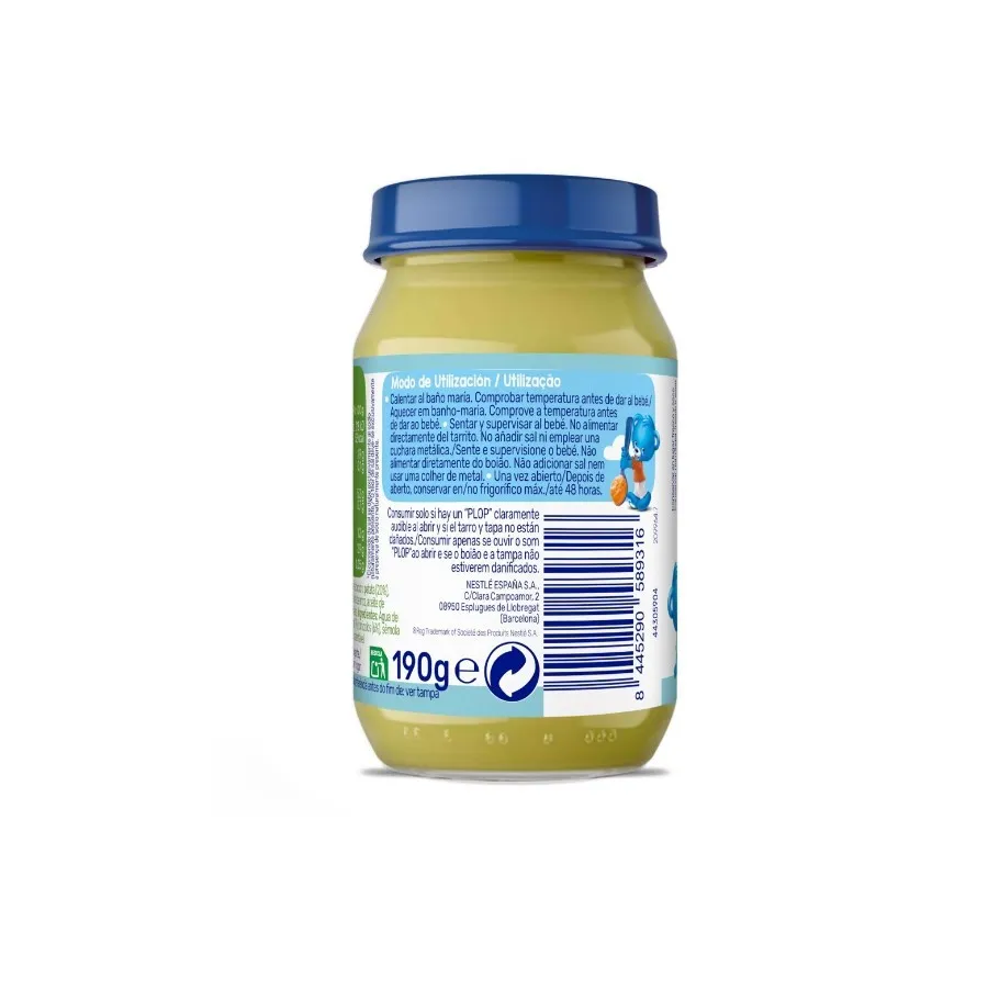 Potito elaborado con ingredientes de primera calidad, especialmente seleccionados para bebés. Se preparan sin sal añadida y sus ingredientes se cuecen al vapor para conservar toda su riqueza nutricional.