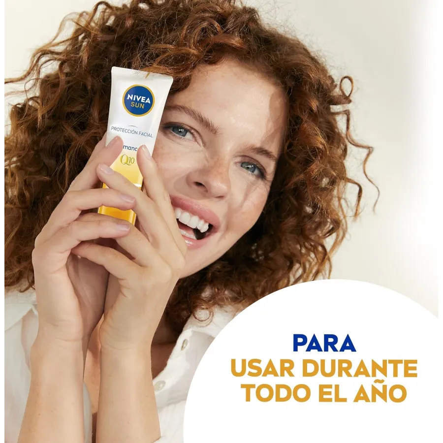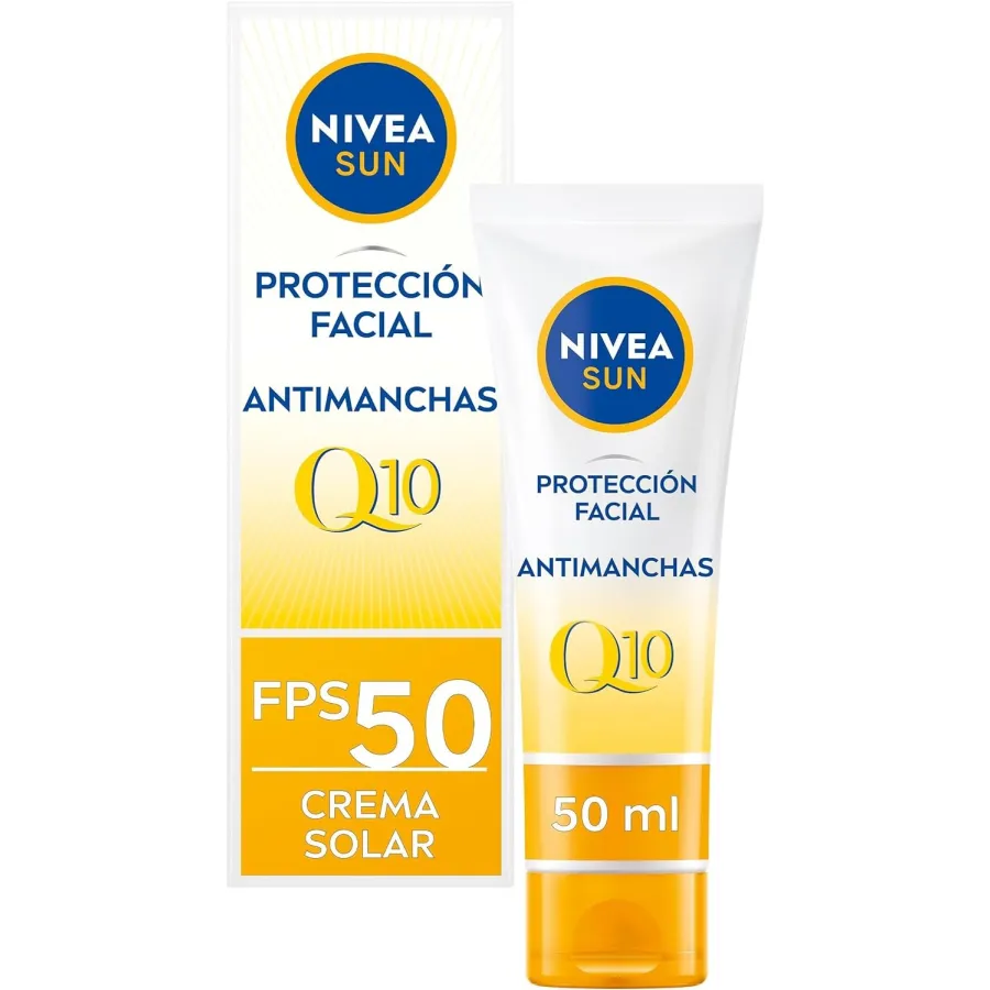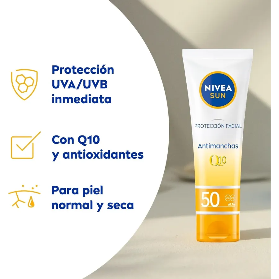 La protección facial antimanchas y antiedad Q10 SPF+50 de Nivea Sun es la mejor opción para combatir los efectos nocivos de la radiación solar. Gracias a la combinación de una alta protección solar enriquecida con la coenzima Q10 esta crema de uso diario proporciona protección desde las capas más profundas de la piel, hidratación prolongada y un resultado sedoso para que disfrutes del sol sin preocupaciones y con un rostro rejuvenecido.