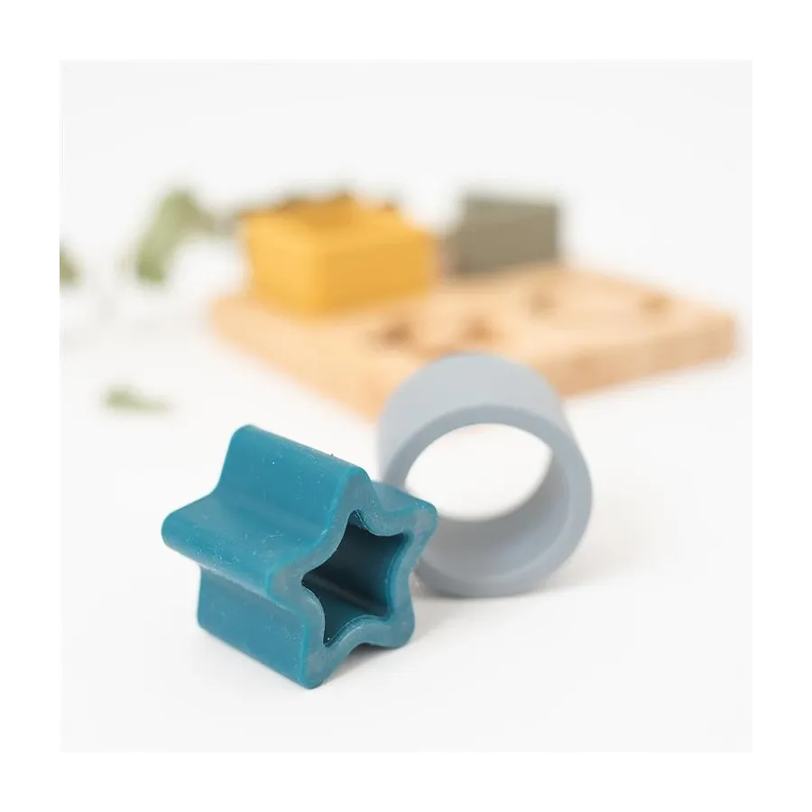 Puzzle con 4 piezas geométricas de silicona y base de madera