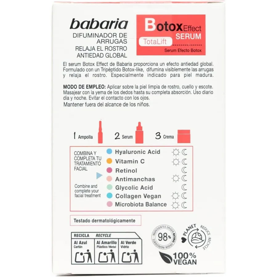 El botox relaja los músculos del rostro evitando las contracciones para lograr un aspecto liso y joven, evitando la aparición de arrugas. Gracias al tripéptido Botox like, que está compuesto por 3 aminoácidos que relajan el rostro, el sérum botox de Babaria tiene el poder actuar en las las capas más profundas de la piel logrando unos resultados increíbles. Descubre un efecto lifting total especialmente indicado para pieles maduras. Úsalo en tu rutina diaria y no esperes más para disfrutar de todos los beneficios.