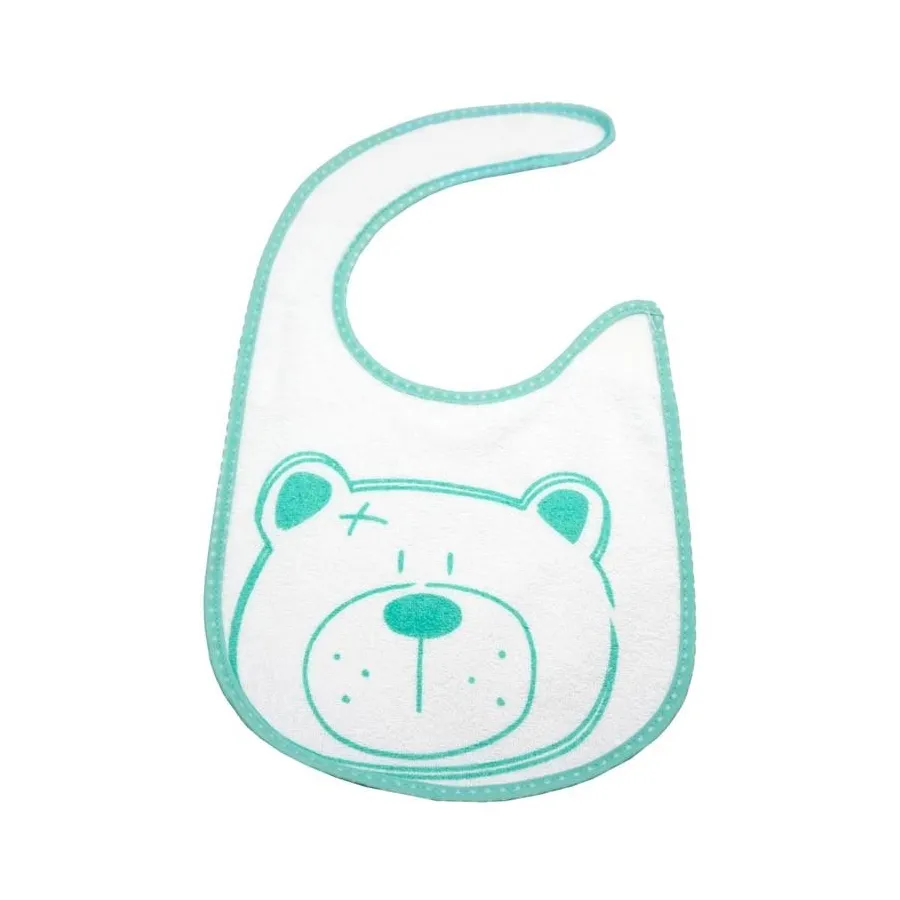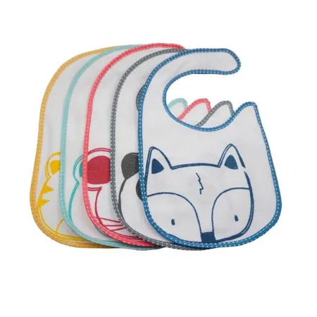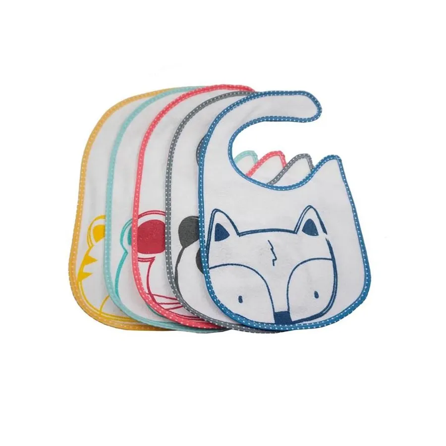 Preciosos Sets de 5 Baberos decorados con divertidos dibujos son super fáciles de utilizar y de limpiar. Compuesto de algodón en su parte frontal y EVA en la trasera. Tiene un suave velcro para abrochar con delicadeza.