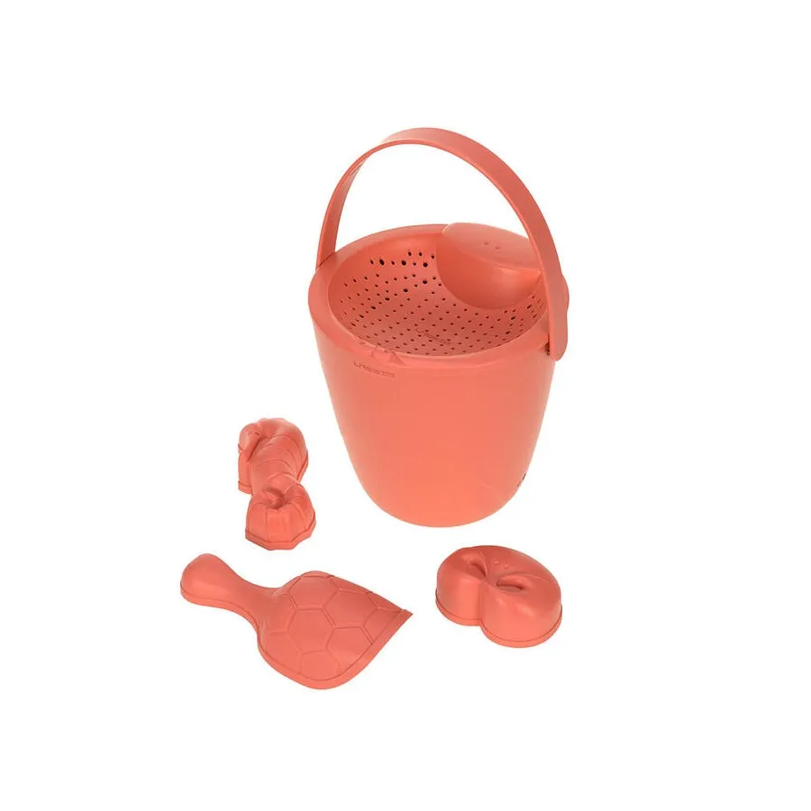 Este precioso set de Lassig está formado por 5 piezas: 1 cubo con asa, dos moldes (uno con forma de caballito de mar y otro con forma de cangrejo), una pala con forma de tortuga y colador con forma de pulpo. En la base del cubo hay incorporado un molde de estrella para empujar y dibujar fácilmente en la arena mojada, ¡Qué divertido!