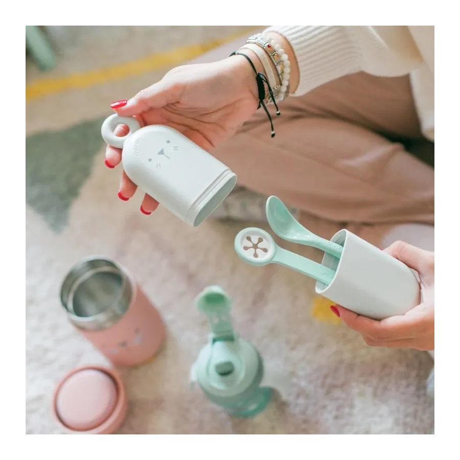 Este fabuloso set cucharas on the go está diseñado para el exterior. Es un práctico estuche imprescindible para cualquier salida. Contiene 1 cuchara ergonómica para fomentar la autonomía del bebé y un sujeta baberos que transforma una servilleta en un babero funcional. ¡Puedes personalizar la cuchara y el estuche con el nombre del bebé! Fácilmente esterilizable en el lavavajillas y capacidad para 2 cucharas.
