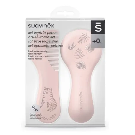 Set de cepillo y peine de Suavinex. Dos piezas diseñadas en color rosa, con cantos redondeados y cerdas muy suaves y flexibles que respetan el cuero cabelludo del bebé.