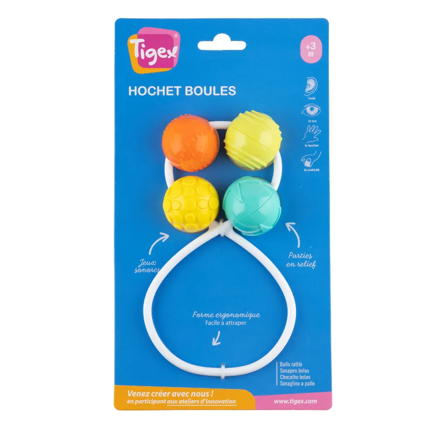 Con un acabado suave y libre de aristas, el Sonajero de Bolas Tigex ofrece un agarre cómodo incluso para los más pequeños. Sus colores vivos y contrastados captan la atención del bebé, potenciando su visión y capacidad de concentración.