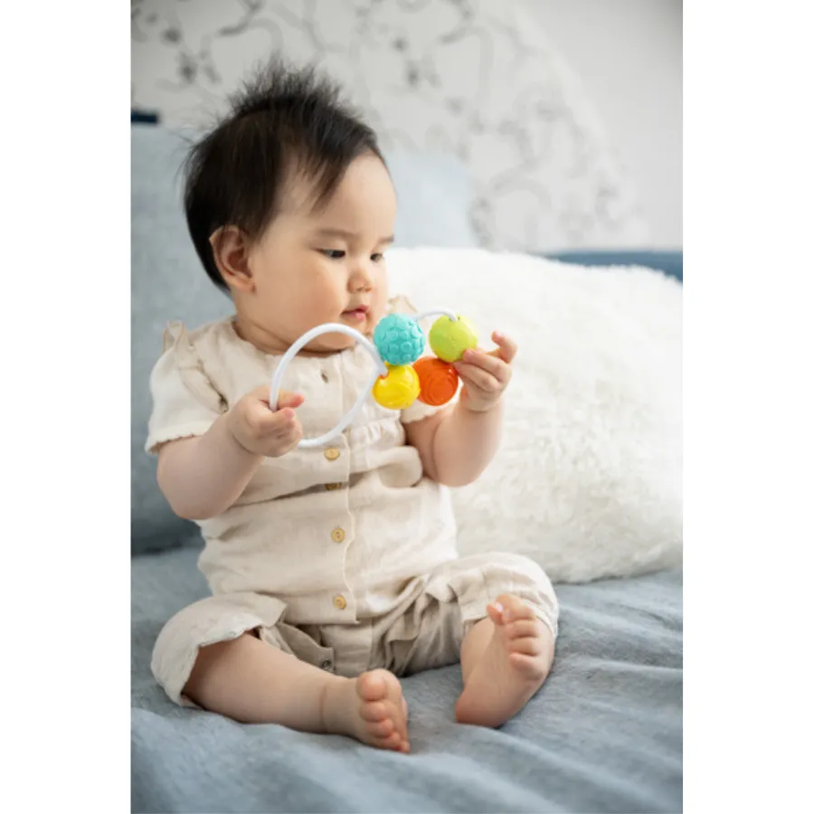 Este juguete sensorial para bebés ha sido diseñado específicamente para estimular los sentidos del bebé de forma natural y divertida. Sus bolas interiores emiten un suave sonido al agitarlo, lo que estimula el oído, mientras que el diseño ergonómico potencia el desarrollo de la destreza manual.