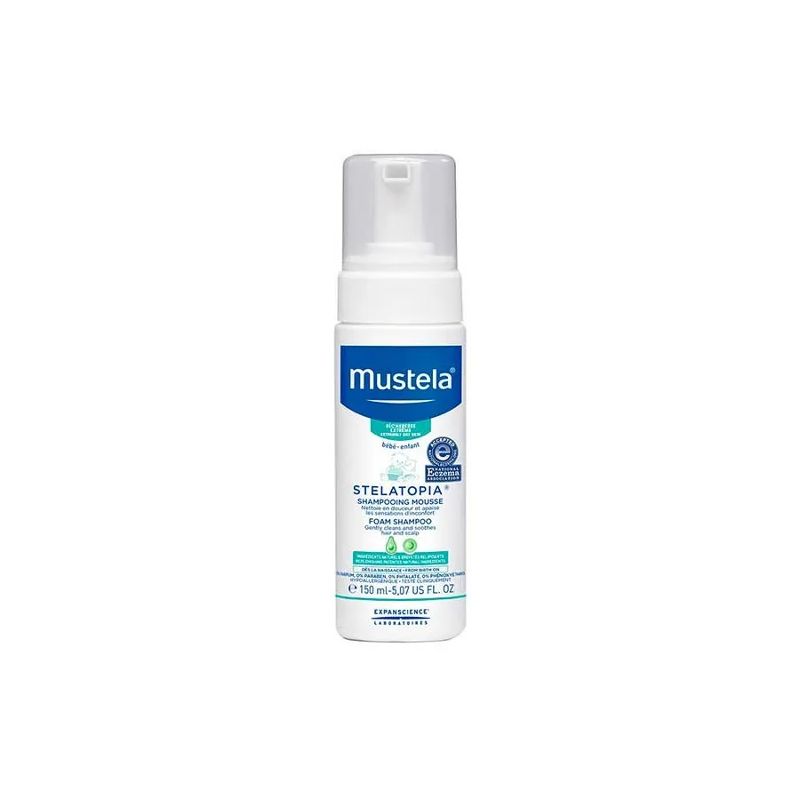Stelatopia champú mousse de Mustela. Limpia la piel con suavidad, disminuye la sequedad, alivia inmediatamente la sensación de inconfort del cuero cabelludo. Espuma suave y untuosa fácil de aplicar, adaptada al cuero cabelludo de las pieles atópicas. Se aclara fácilmente